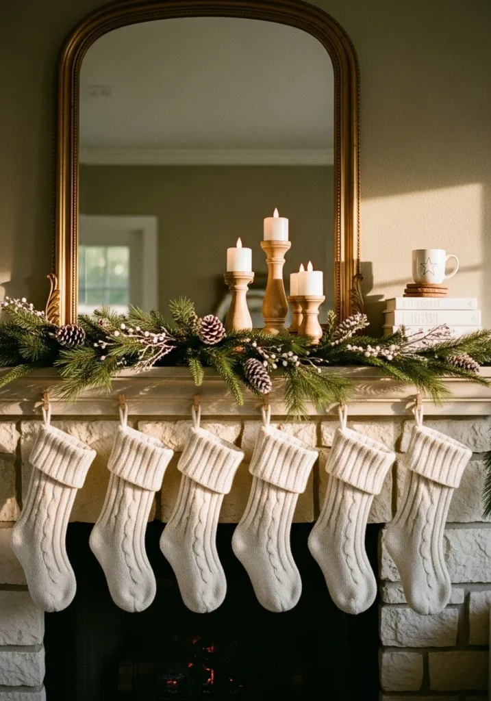 This fireplace mantel is the definition of effortless holiday charm. A row of chunky knit stockings in creamy ivory hangs neatly across the stone hearth, instantly adding warmth and texture. Above, a lush garland of pine branches, frosted pinecones, and delicate white berries brings a natural touch that feels fresh and timeless. Wooden candle holders with soft white candles and a few stacked books complete the look under a gold-rimmed mirror that reflects the gentle winter light. Everything about this setup whispers calm, cozy, and beautifully balanced.