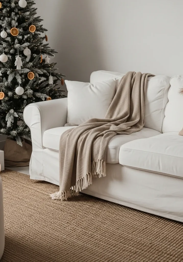 I love how this setup feels so natural and easy to recreate. The neutral palette makes the space feel warm without being overwhelming, and those little touches of texture—from the knit throw to the woven rug—bring everything together. It’s proof that you don’t need glitter or bold colors to make your home feel festive, just a few soft neutrals and cozy layers that make you want to curl up with a mug of hot chocolate.