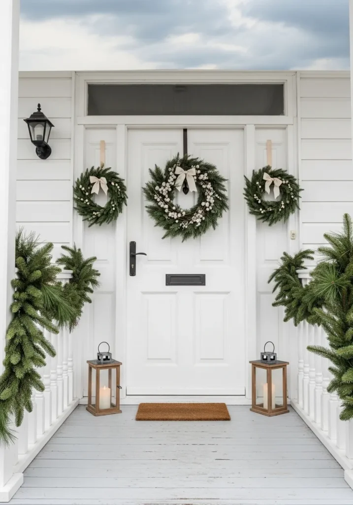 This neutral Christmas porch is the perfect example of how simplicity can make the biggest statement. The crisp white backdrop sets off the lush evergreen wreaths adorned with soft ivory ribbons and delicate white berries, creating a look that feels both polished and natural. Wooden lanterns with glowing candles flank the entryway, adding a warm touch that balances the cool tones of the setting. The subtle symmetry of the design makes the whole space feel calm, collected, and effortlessly stylish.