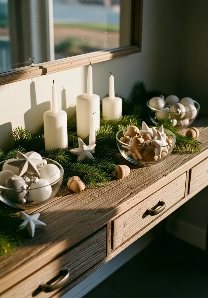 This cozy setup is all about understated charm. A rustic wooden console is dressed with fresh pine branches, creamy white candles, and glass bowls filled with neutral ornaments in soft ivory, matte beige, and glossy white. The sunlight streaming through the window gives everything that golden-hour glow, making the natural textures of the wood and greenery feel extra warm and festive. It’s simple, balanced, and quietly elegant—like Christmas morning before the wrapping paper chaos begins.