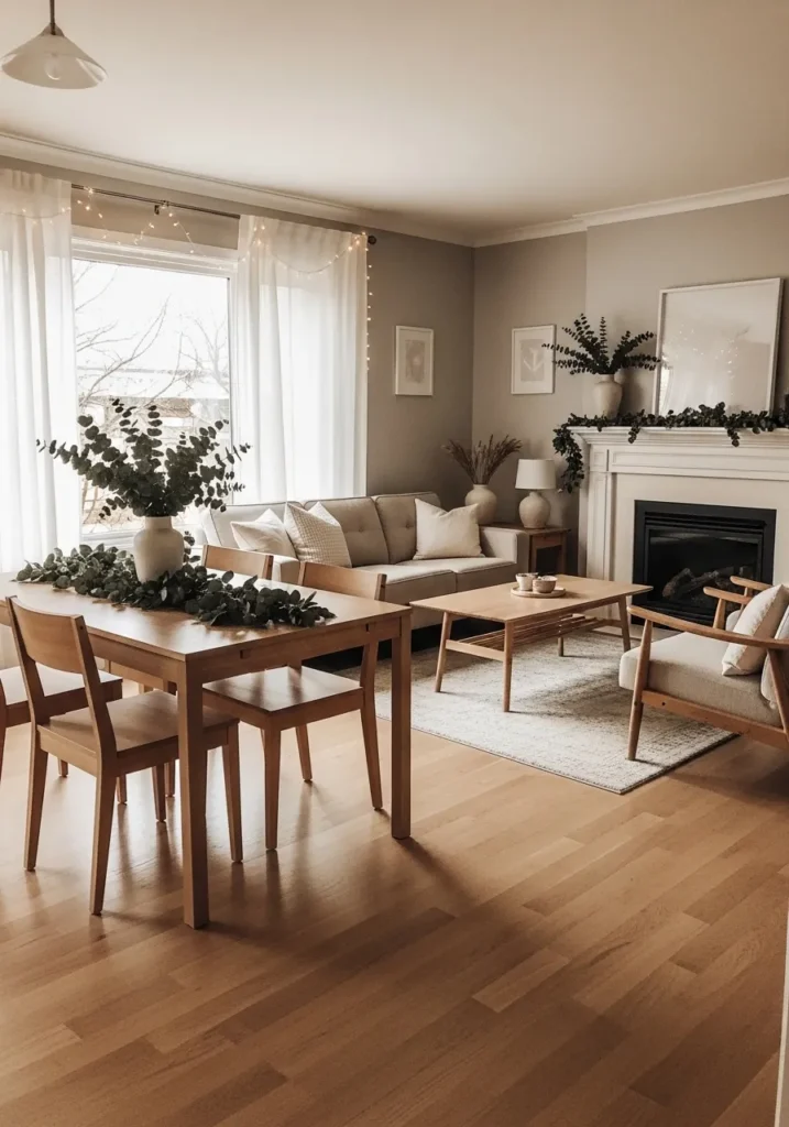 This living and dining space is the perfect example of calm and cozy meeting modern minimalism. Soft beige walls, warm wood tones, and clean lines make the whole room feel effortlessly balanced. The neutral sofa, pale area rug, and simple wooden furniture give the space a Scandinavian charm that feels both stylish and livable. A touch of greenery adds freshness, while delicate string lights drape gently across the curtains, bringing in that subtle Christmas sparkle without overpowering the serene color palette.