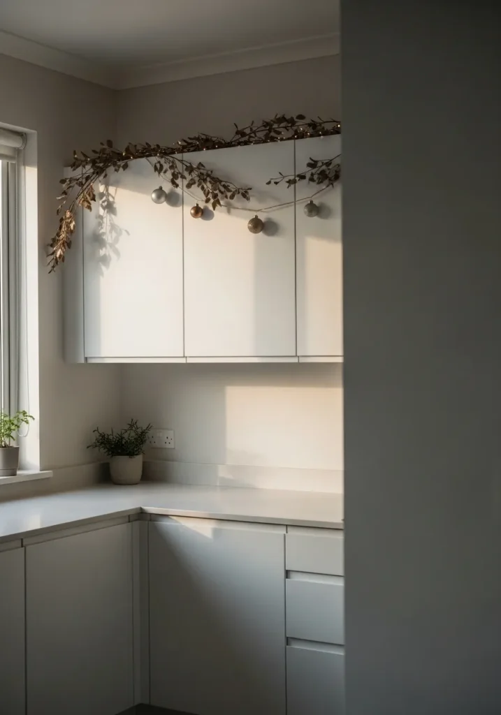 This kitchen captures that perfect blend of calm simplicity and festive spirit. Smooth matte cabinets in soft beige tones set a serene backdrop, while a delicate garland draped above adds just enough Christmas charm. The string of muted ornaments and twinkling fairy lights feels effortlessly subtle, letting natural light bounce across the space in the prettiest way. A single potted plant tucked into the corner keeps the look grounded and fresh, reminding you that less really can be more.