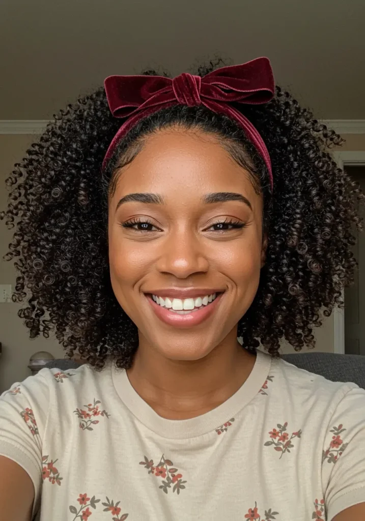 These bouncy curls look absolutely joyful and full of personality. The natural texture gives so much life to the style, while the deep red velvet headband adds that perfect festive touch. It’s simple, feminine, and classic all at once—proof that holiday hair doesn’t need to be complicated to feel special.