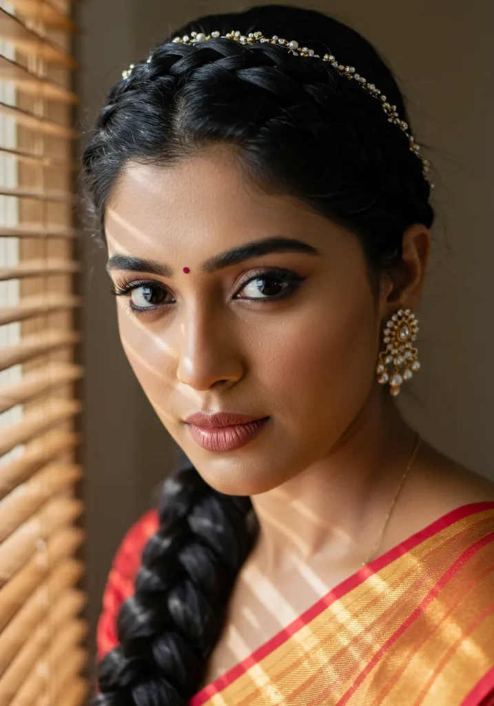 A thick braid wraps gracefully across the head like a crown, finished with a delicate gold and pearl accessory that adds just the right amount of shimmer. The sleek black hair brings out the detail of the braid, creating a look that’s regal and timeless.
