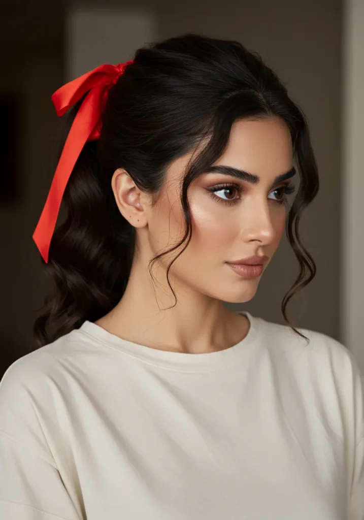 This classic ponytail gets a festive upgrade with soft waves and a bold red ribbon tied at the base. The glossy brunette hair falls in gentle curls, with a few loose tendrils framing the face for a romantic finish.