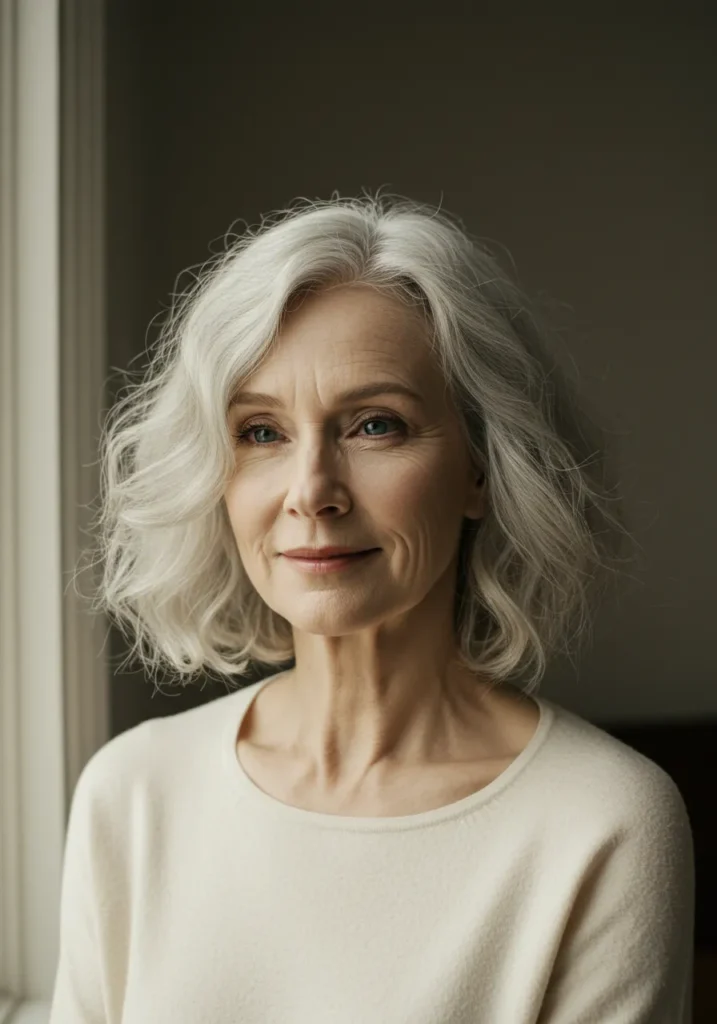 Silvery-white hair styled into soft, layered waves gives this look a graceful, timeless feel. The mid-length cut adds body and bounce, while the natural shine makes it glow beautifully in soft light.