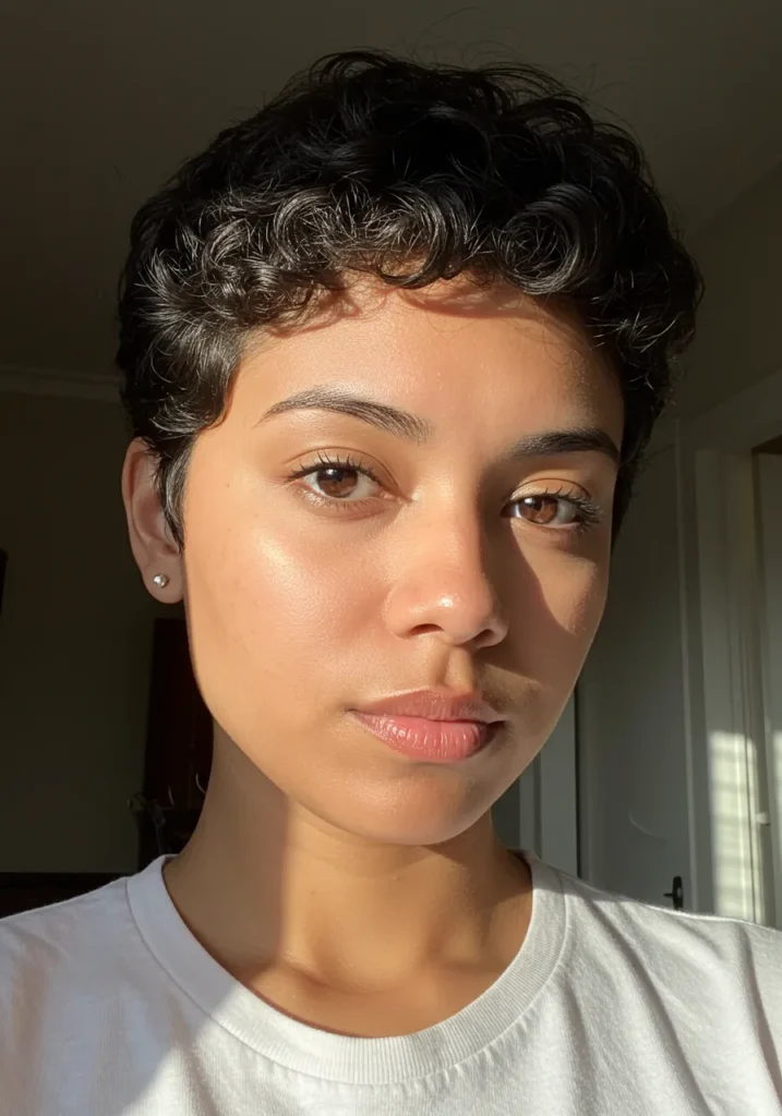 Short, natural curls give this look a playful, confident charm. The pixie cut shows off the face beautifully, and the soft texture keeps it feeling youthful and fresh. It’s simple, stylish, and so easy to wear for the holidays.