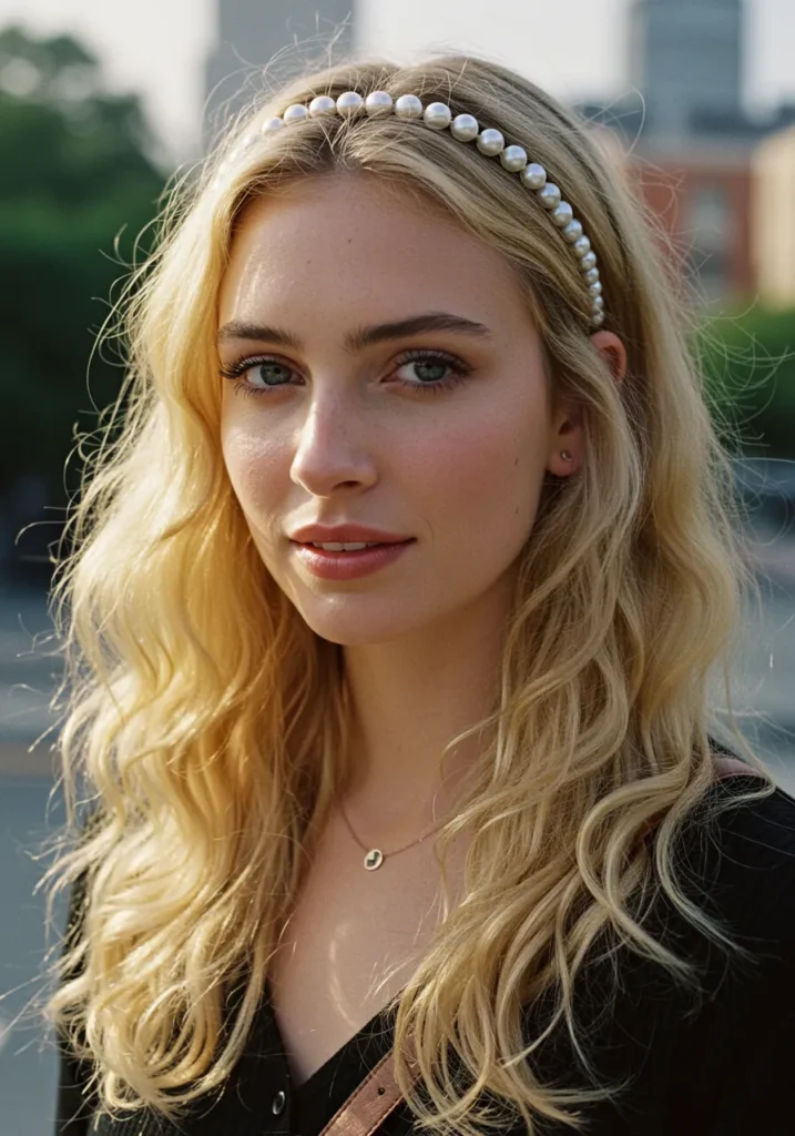Soft golden waves paired with a pearl headband make this look feel dreamy and festive. The pearls add a subtle sparkle that feels just right for the season, while the effortless texture keeps it from looking overdone.