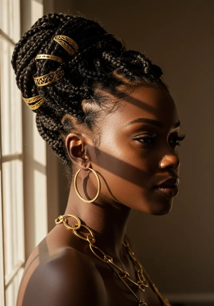 A high braided bun with gold cuffs woven throughout makes a bold yet graceful statement. The intricate braids add texture and drama, while the golden touches catch the light beautifully, creating a festive finish.