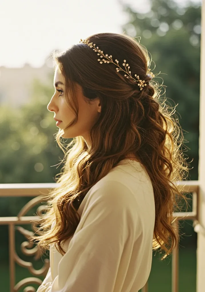 Long cascading waves flow beautifully down the back, softly gathered into a half-up style. The golden hair accessory adds a hint of sparkle without being over the top, catching the light like holiday décor in the best way. The warm chestnut tones glow under soft daylight, giving this look a dreamy, classic feel.