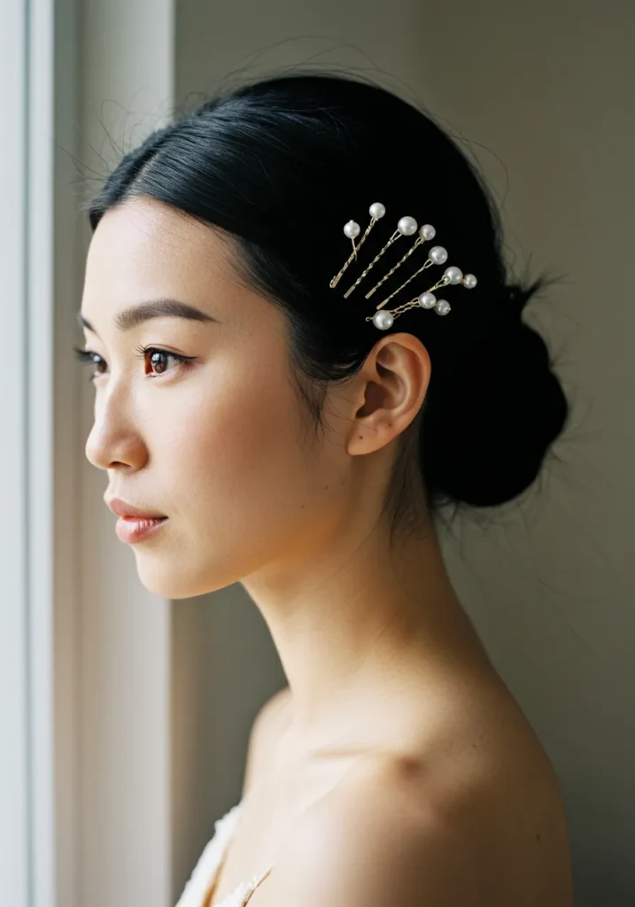 A smooth, low bun paired with delicate pearl pins gives this look a beautifully classic feel. The sleek black strands are neatly tucked away, creating a flawless shape that highlights the neckline and adds a touch of quiet sophistication. The pearls bring in that holiday sparkle without being too much.