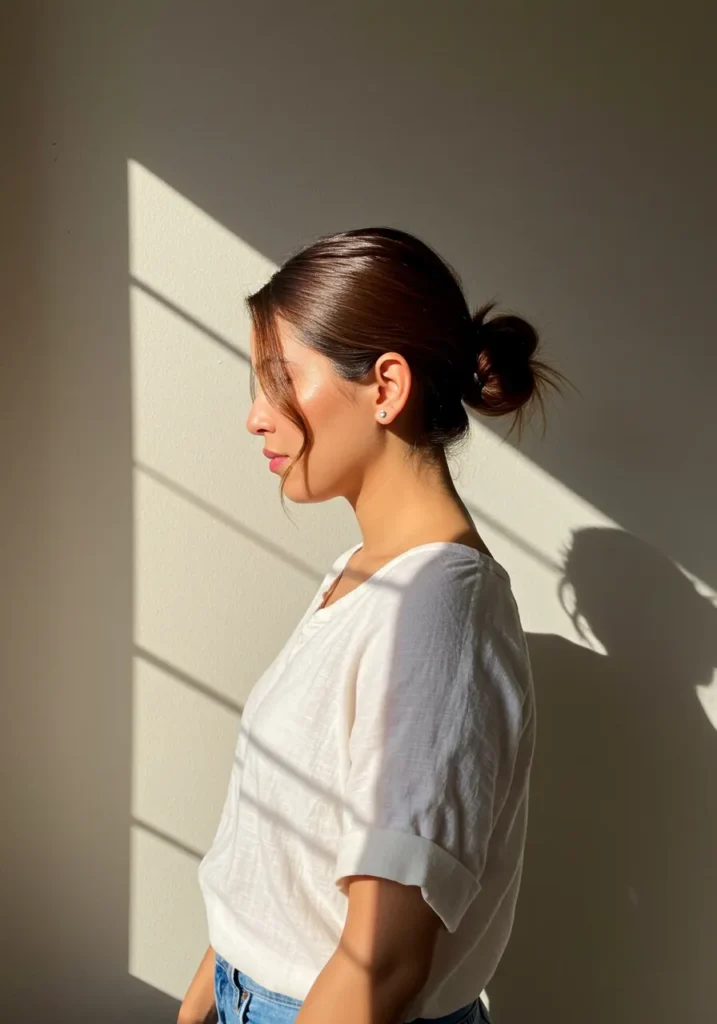 This sleek low bun is pure minimal elegance. The glossy brown hair is smoothed back neatly, with two delicate face-framing strands that soften the structured look. The subtle shine from natural light makes it feel polished yet understated, the kind of style that whispers sophistication.