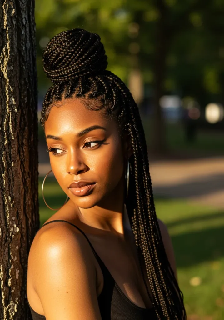 The neat box braids are swept up into a high bun that feels bold yet sophisticated. The intricate braiding adds texture, while the smooth top knot keeps everything elegant and structured. Under the warm sunlight, the braids give off a subtle sheen that makes the whole look stand out beautifully.