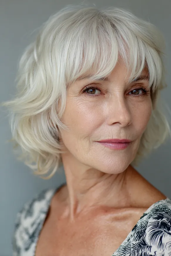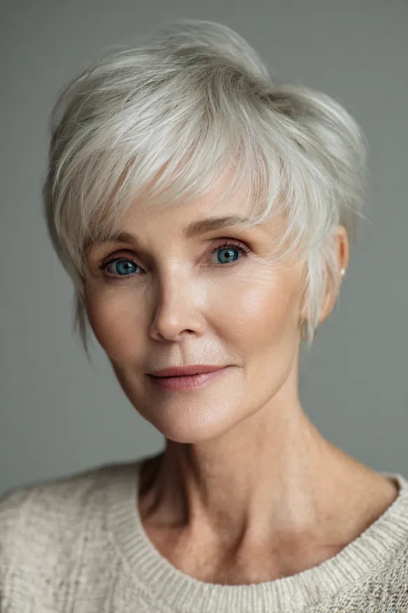 This pixie cut is all about relaxed beauty. The tousled texture gives it a breezy, effortless feel, while the soft fringe gently skims the eyebrows for a flattering touch. The silvery tone is bright and natural, adding a lovely glow that enhances the skin’s radiance. It’s a little bit shaggy, a little bit chic, and completely comfortable.