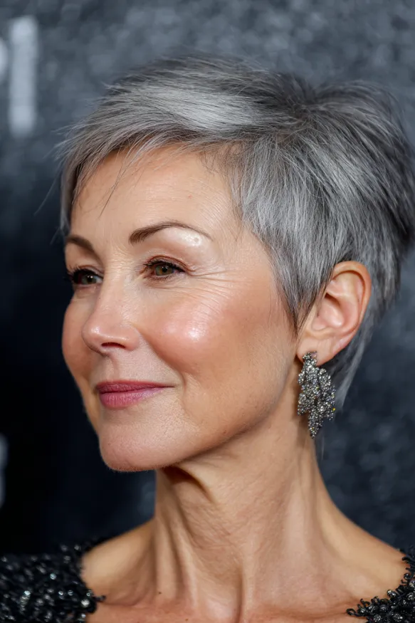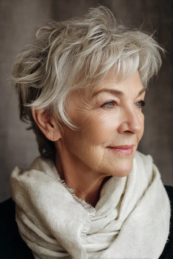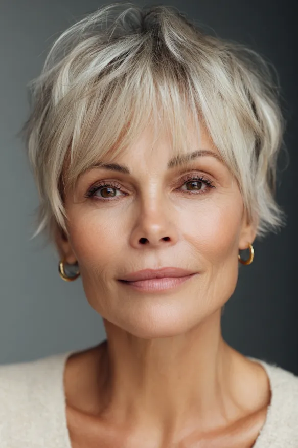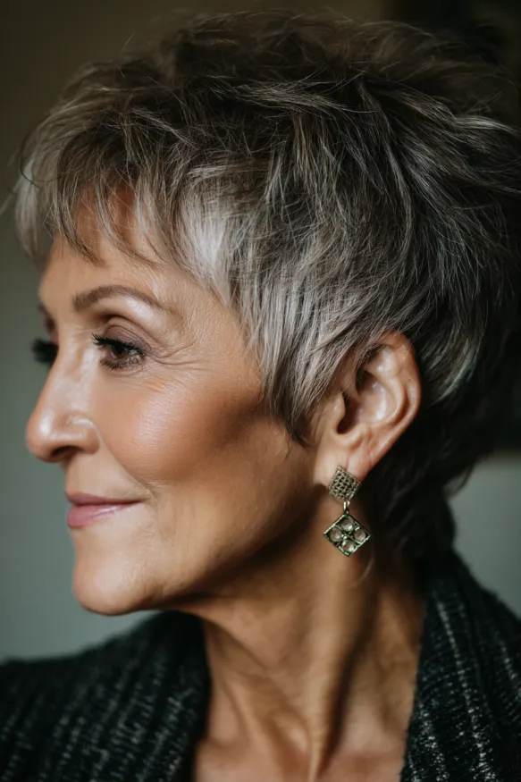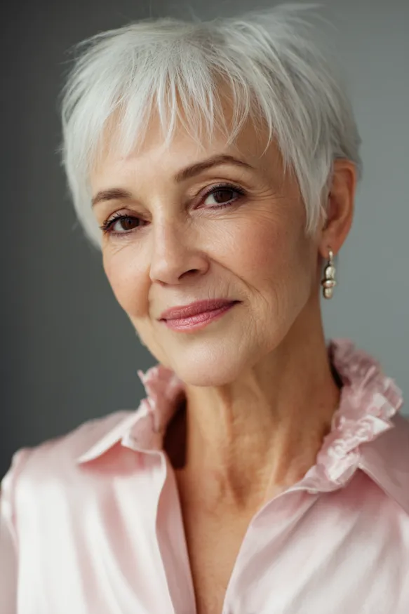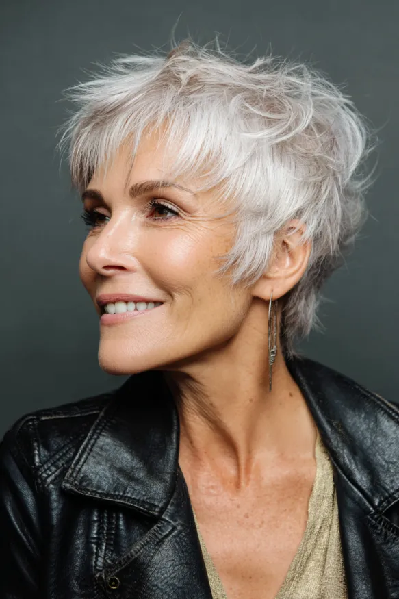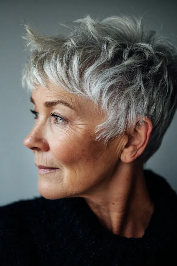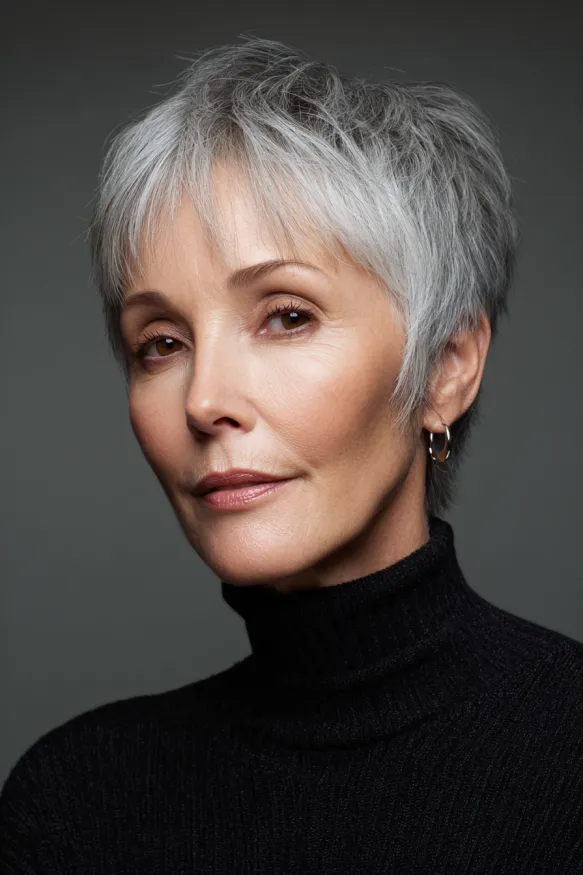 This pixie cut is all about structure and definition. It features short, choppy layers that build gentle volume at the crown and create a full, flattering shape. The color blends natural grey with soft silver highlights, giving it depth and a touch of glam. The bangs are short and light, letting the eyes shine while still softening the forehead.