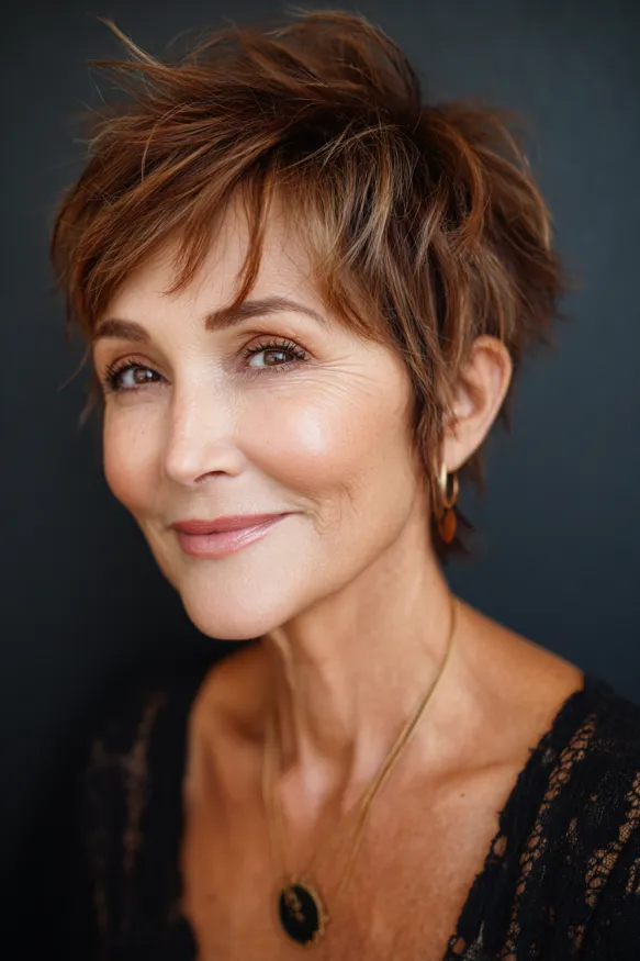 Tousled Pixie with Warm Chestnut Highlights