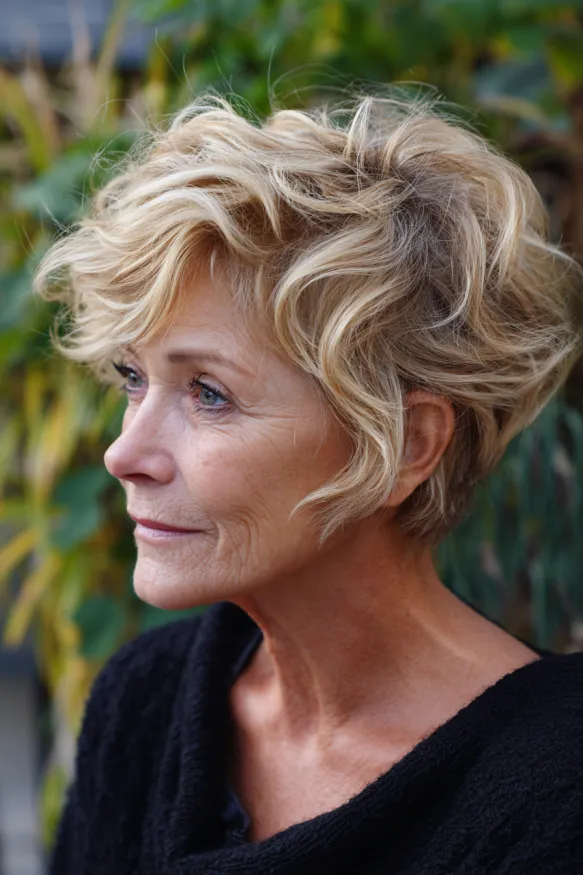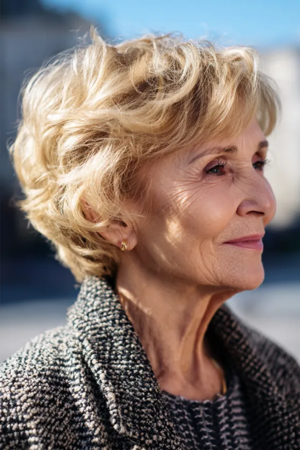 This pixie leans into softness with fluffy layers and gentle, windswept waves. The crown has just the right amount of volume, while the sides are feathered and light. The warm honey-blonde tone gives it a cheerful, youthful glow that brightens the whole face. It’s perfectly airy without being too messy, making it ideal for everyday wear.