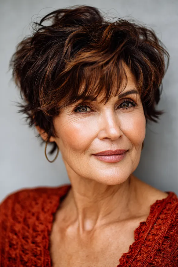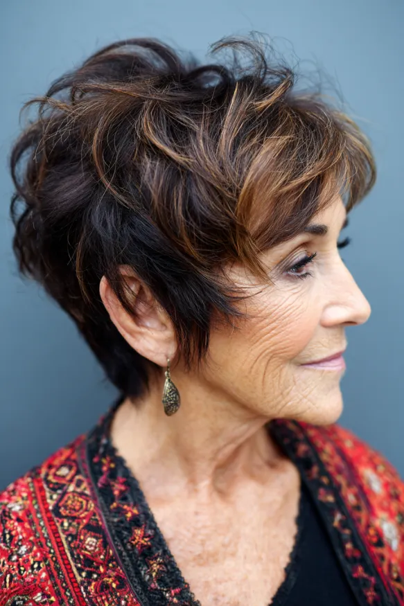 This pixie haircut is bursting with volume and personality. The layers are slightly longer on top and crown, giving it a full, airy look that lifts the whole face. The front pieces sweep gently across the forehead, creating a flattering frame that softens the cheekbones. The deep brown base is brought to life with caramel streaks, adding texture and a sun-kissed glow.