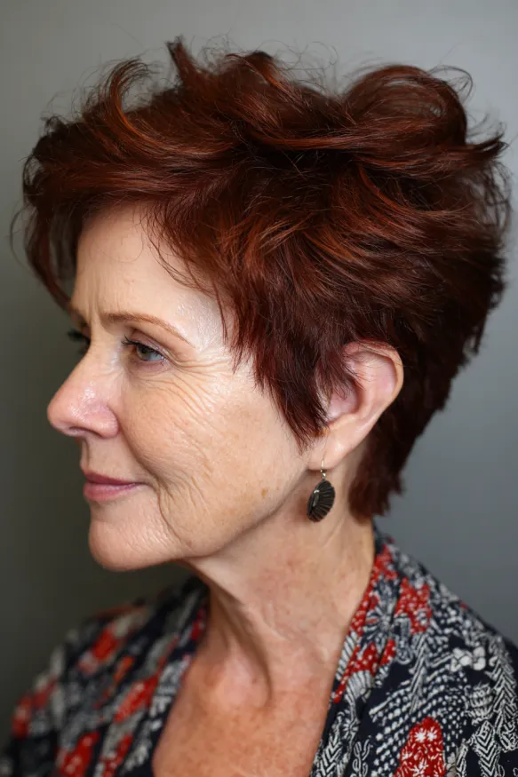 This pixie is full of energy and personality. The top layers are styled in a spiky, flipped-up fashion that gives the cut height and playful movement. The back and sides are kept neat and close, creating a nice contrast with the wild, tousled crown. The deep auburn color is warm and vibrant, adding a fiery touch that’s hard to ignore.