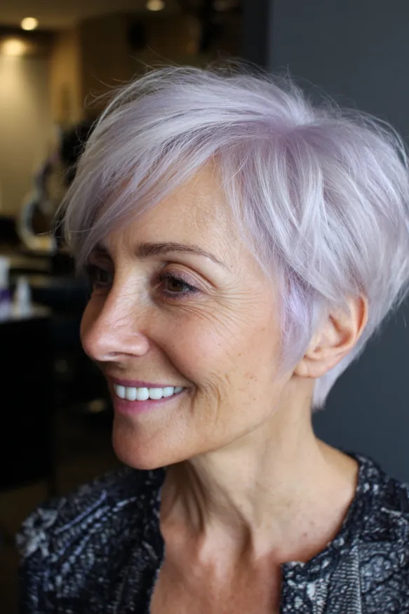 This pixie is all things soft and modern. It’s got a full crown with long, layered bangs that sweep to the side, creating a flattering frame around the face. The color is what really makes it magical—an icy platinum blonde kissed with the faintest touch of lavender. It’s subtle but striking, and gives the cut an ultra-stylish glow.