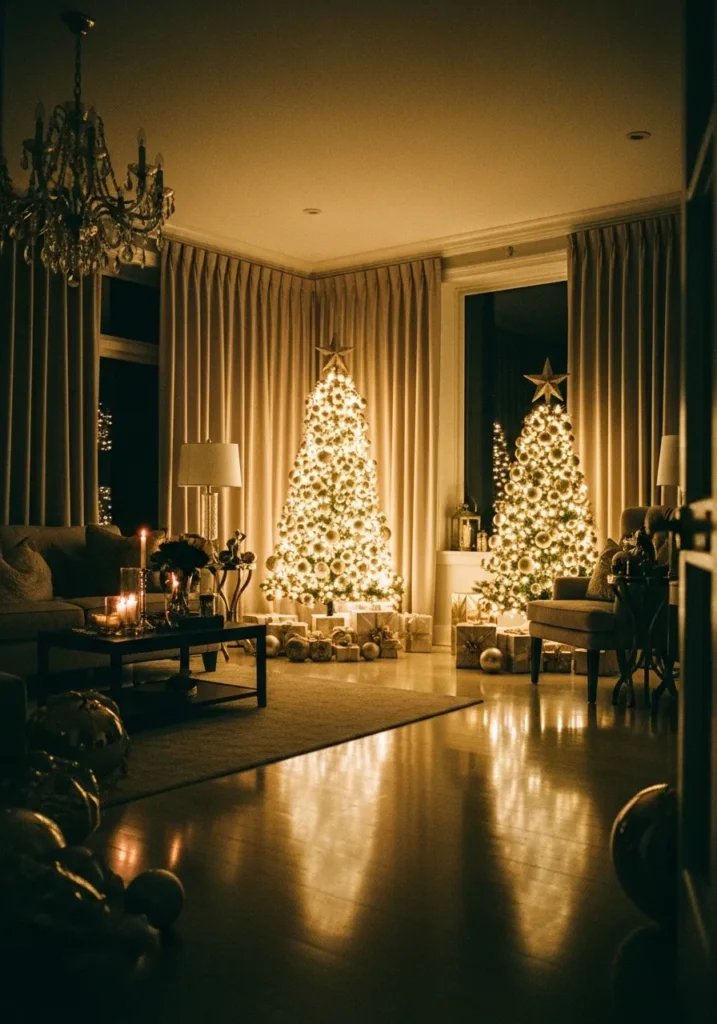 Glowing Twin Christmas Trees in a Luxe Living Room