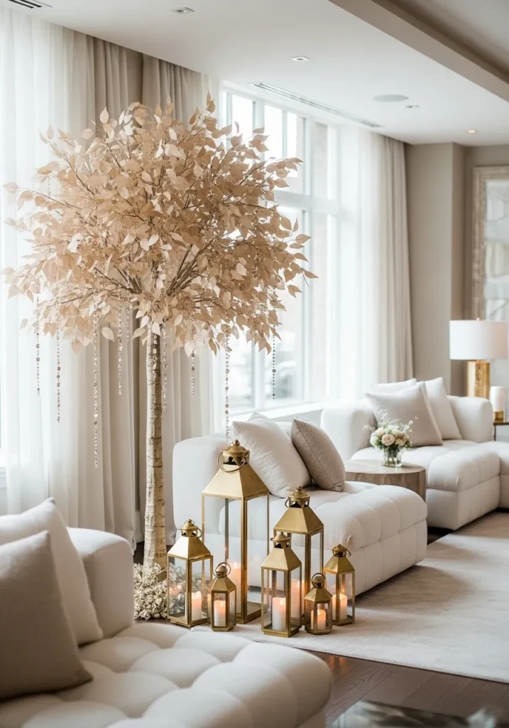 This stunning living space feels like a cloud kissed by Christmas magic. The palette is all about creamy whites, soft taupes, and golden accents that glow beautifully in natural daylight. The centerpiece is a whimsical indoor tree with champagne-colored leaves, sparkling with delicate crystal strands that catch every bit of light. Around its base, clusters of brass lanterns with flickering candles add the perfect cozy sparkle, making the room feel luxurious yet inviting. Plush tufted seating and layers of pillows complete the serene winter look.
