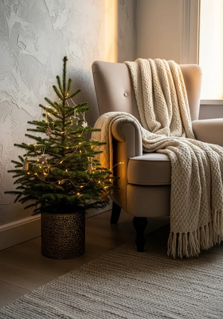This cozy nook feels like a quiet little retreat from the holiday rush. A soft beige armchair sits beside a petite Christmas tree glowing with warm fairy lights and delicate ornaments. The textured cream throw draped across the armrest adds just the right touch of warmth, while the golden glow from the nearby window gives the whole scene a comforting, homey charm. It’s simple, elegant, and effortlessly festive without feeling overdone.
