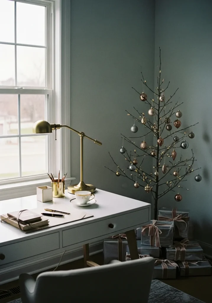 This cozy little corner proves that Christmas magic doesn’t have to shout to be heard. A simple white desk sits by a bright window, dressed with a few elegant touches like a golden lamp, sleek stationery, and a dainty teacup. The star of the space is the minimalist twig tree in the corner, decorated with metallic ornaments in shades of gold, rose, and silver. Stacked presents wrapped in muted paper and satin ribbons add a soft festive finish without overwhelming the serene palette.