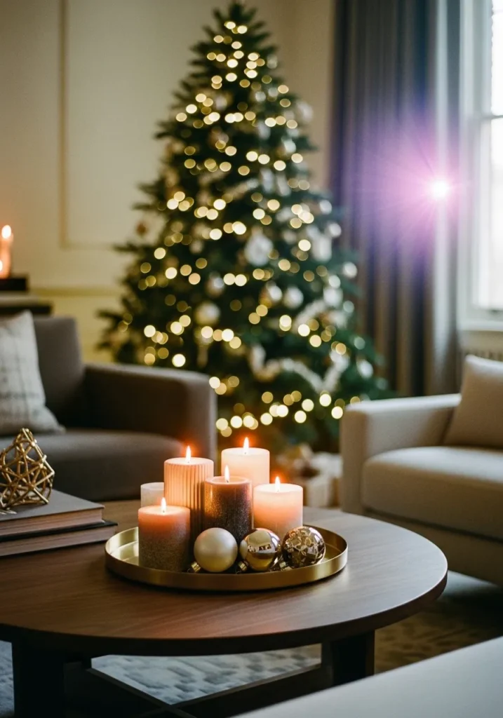 This living room feels like a warm hug wrapped in twinkling lights. A tall Christmas tree sparkles in the corner, dressed in golden fairy lights and soft metallic ornaments that shimmer gently against the neutral walls. The centerpiece is a round wooden coffee table with a golden tray filled with glowing candles and glistening baubles, giving the whole room a touch of understated luxury. Plush armchairs and rich curtains complete the look, creating a space that feels both elegant and deeply comforting.