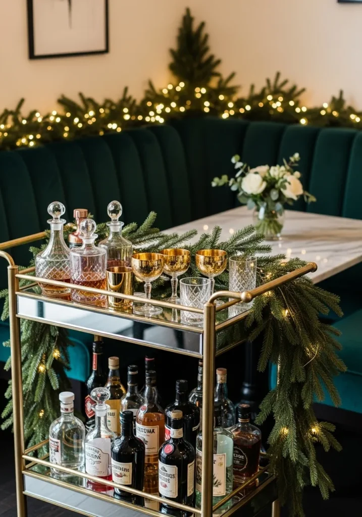 This home bar setup looks like something straight out of a festive movie scene. The gold bar cart glimmers under soft Christmas lights, dressed up with evergreen garlands that drape elegantly around its frame. Crystal decanters, golden-rimmed glasses, and a marble-top table nearby bring a luxurious yet cozy feel, perfectly balancing modern glam and classic Christmas charm. The deep emerald seating in the background adds richness, while a touch of fresh greenery in the vase keeps things naturally elegant.