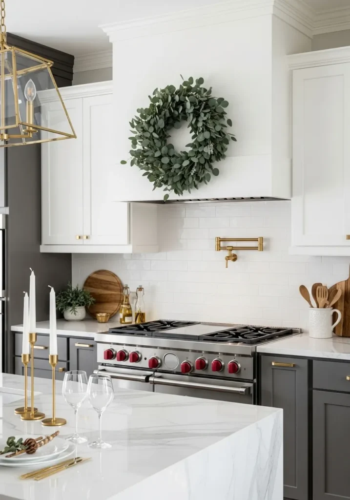 This kitchen feels like the perfect blend of sophistication and Christmas cheer. The clean white cabinetry and marble countertops create a bright, luxurious base, while the soft gray lower cabinets add beautiful depth. Brass fixtures and accents, from the sleek pot filler to the modern candle holders, give the space that subtle festive shimmer without overdoing it. The eucalyptus wreath above the range is the cherry on top—simple, natural, and perfectly fresh against the crisp white tile backsplash.