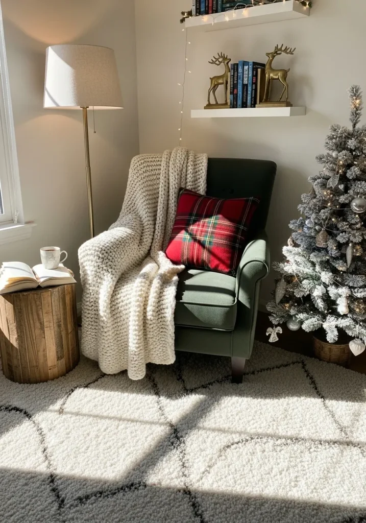 This space feels like the perfect little retreat for slow winter mornings. The deep green armchair adds a timeless touch, paired with a chunky cream knit blanket that practically begs you to curl up with a cup of cocoa. The plaid pillow brings that classic holiday pop of red, while the frosted mini Christmas tree beside it sparkles softly under the string lights. The wooden side table, open book, and mug complete the warm and lived-in charm, making it the kind of corner that just radiates peace and comfort.