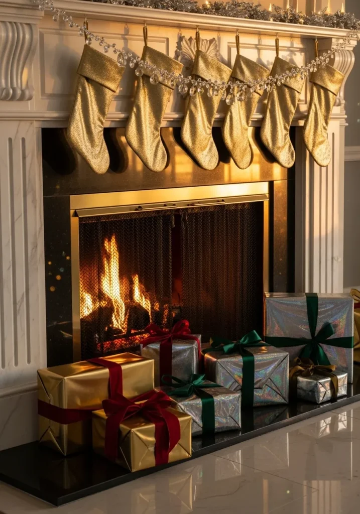 This elegant fireplace setup glows with timeless Christmas luxury. The golden stockings shimmer beautifully against the creamy white mantel, while crystal garlands add a touch of sparkle that catches the firelight just right. Wrapped gifts in metallic gold and silver with deep red and emerald ribbons complete the picture, creating a scene that feels both festive and sophisticated. The flickering fire casts a warm glow on the polished marble floor, making the entire space feel cozy yet undeniably high-end.