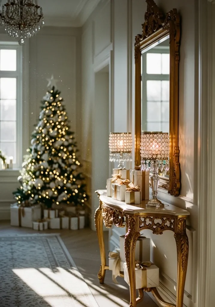 This luxurious hallway feels like stepping into a holiday dream. The tall Christmas tree in the background sparkles softly with golden lights, perfectly complementing the ornate gilded mirror and console table. Every element here whispers sophistication—from the crystal lamps casting a gentle glow to the beautifully wrapped presents lined neatly beneath. The soft natural light streaming in adds a warm shimmer, making the whole space feel both regal and inviting.