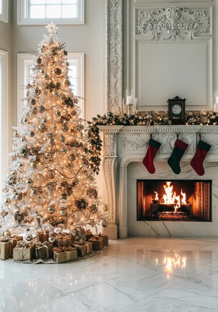 This living room is the definition of timeless holiday glamour. The stunning white Christmas tree shimmers with layers of golden ornaments, delicate glass baubles, and soft twinkling lights that reflect beautifully off the polished marble floor. Beside it, a carved stone fireplace steals the scene, framed by intricate moldings and topped with a garland of greenery and gold. The trio of red and green stockings add the perfect touch of traditional charm, while the roaring fire fills the space with that cozy, storybook glow we all crave in December.