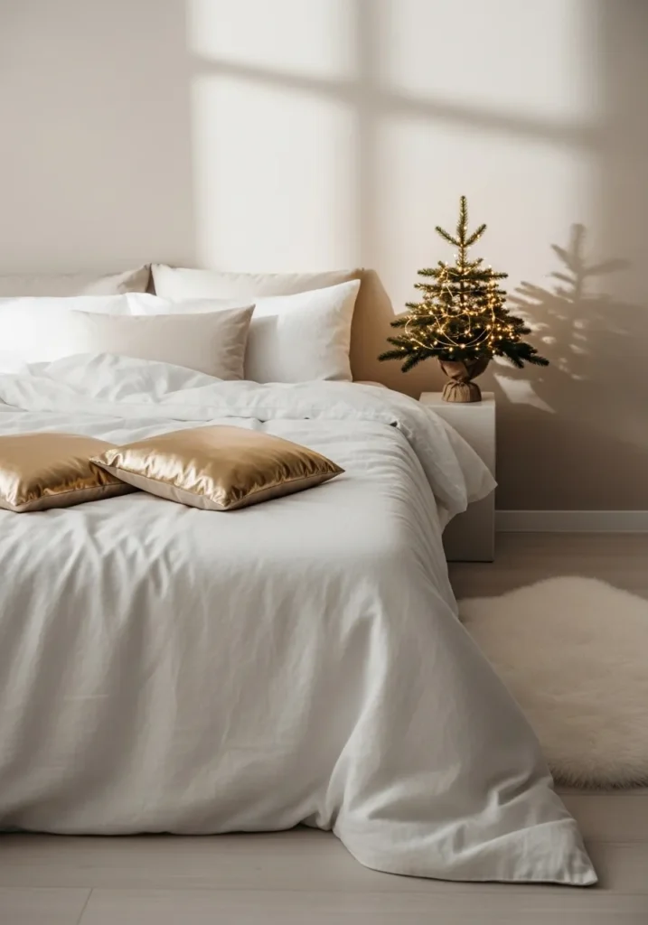 This dreamy bedroom feels like a soft winter hug with its creamy white bedding, golden satin pillows, and a tiny twinkling Christmas tree perched sweetly on the bedside table. The sunlight pouring through the window creates those perfect, lazy morning shadows that make you want to curl up with a cup of cocoa and a holiday movie. Everything about this setup whispers calm luxury, from the fluffy white rug to the subtle shimmer of gold that ties it all together.