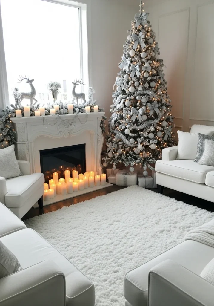This living room feels like stepping straight into a snow-kissed dream. The tall Christmas tree, dressed in soft silver ribbons and sparkling ornaments, stands gracefully beside a white fireplace glowing with rows of warm flickering candles. Frosted garlands with glittering reindeer and shimmering baubles add a touch of magic to the mantel, while the plush white rug and ivory armchairs create a cozy yet polished setting that’s pure sophistication. The whole space glows with a serene winter light that makes everything look effortlessly luxurious.
