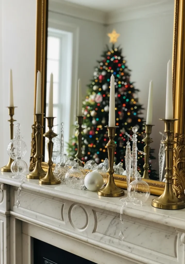 This mantel setup is pure old-world elegance with a modern Christmas twist. The gleaming brass candlesticks create a perfect frame for the soft white candles, their glow bouncing beautifully off the oversized gold mirror. Glass ornaments and crystal icicles are scattered across the marble surface, catching the light in the most delicate way. In the reflection, a lush Christmas tree covered in colorful lights adds a joyful touch that contrasts perfectly with the neutral tones of the room.