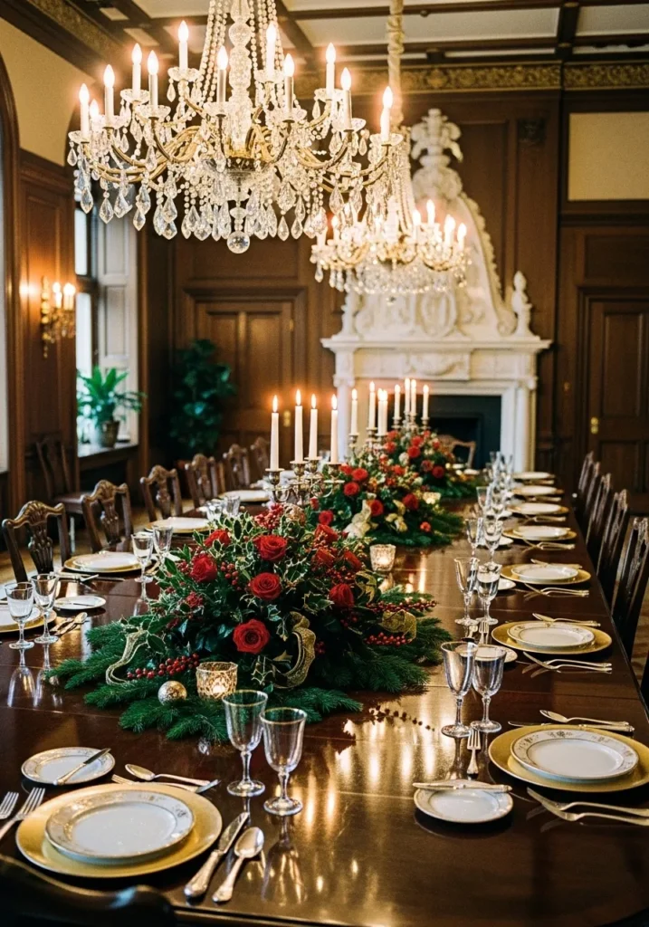 This elegant dining room feels straight out of a royal Christmas celebration. The long polished table gleams beneath crystal chandeliers, each one casting a golden sparkle across the fine china and glassware. The centerpiece steals the show with lush arrangements of red roses, pinecones, evergreens, and golden accents that stretch the length of the table. Classic portraits and draped curtains complete the timeless charm, making the entire space feel like an evening at a historic estate.