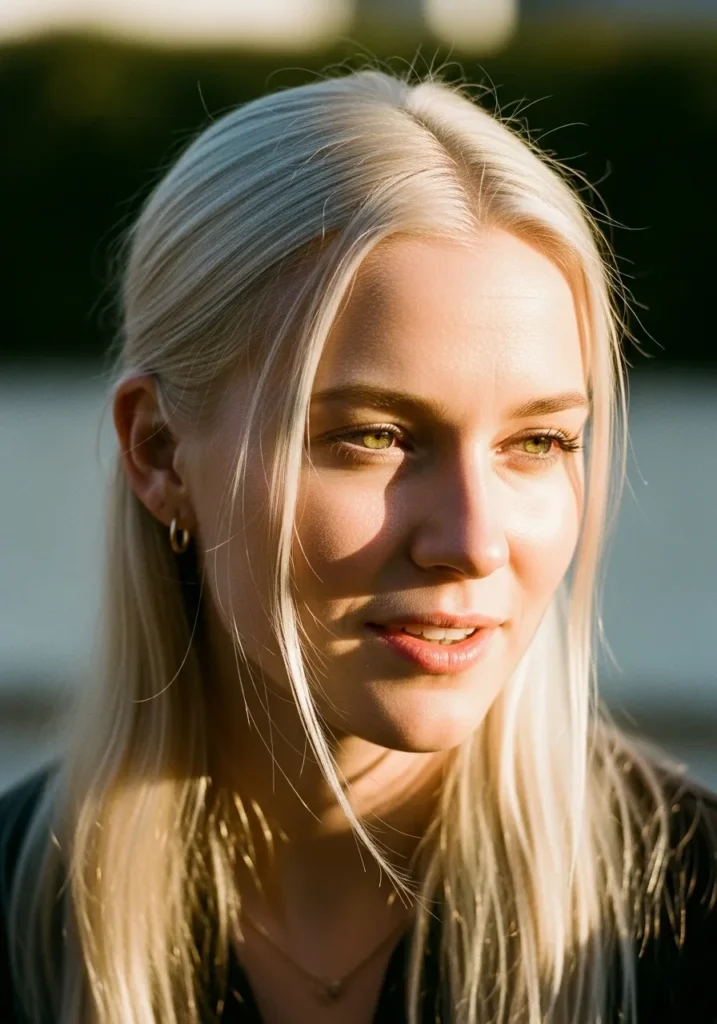 This hairstyle is all about effortless shine and minimalism. The hair is long, straight, and silky with a center part that adds symmetry. The platinum blonde tone catches the light beautifully, and the simple, tucked-behind-the-ear style keeps it clean and modern.