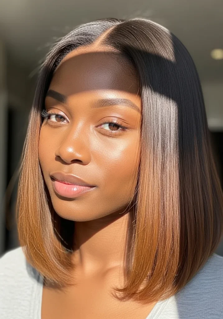 This hairstyle shows off a straight lob with a seamless ombre effect, transitioning from deep brown roots to warm honey ends. The texture is soft and sleek, with a middle part that keeps everything balanced.