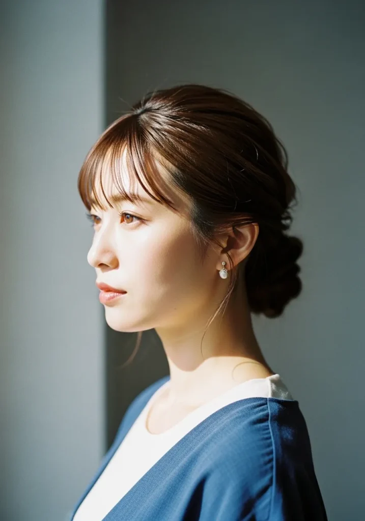 This hairstyle is all about soft elegance. The straight brown hair is swept into a low bun with delicate layers around the face and light, airy bangs. The smooth texture and subtle shine make it perfect for a polished yet natural look.