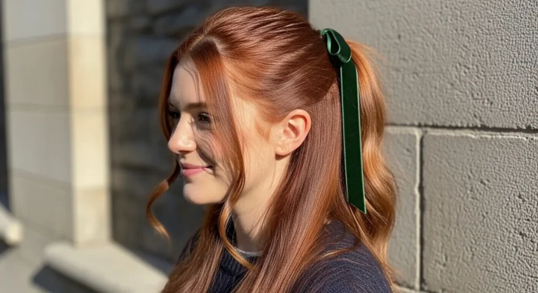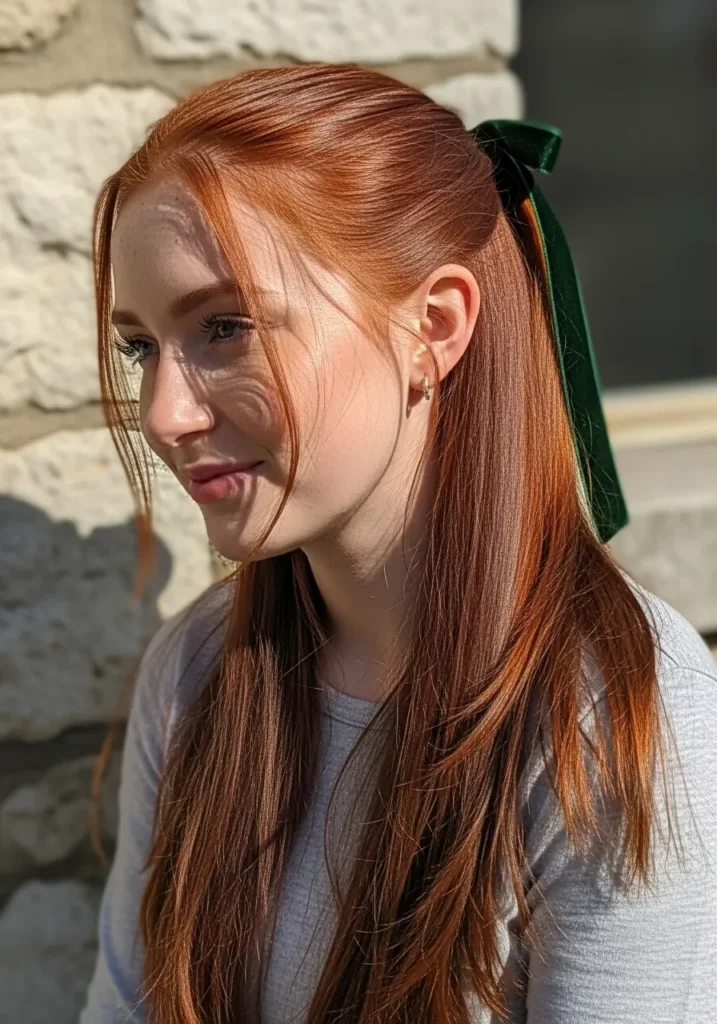 This hairstyle showcases long, silky straight hair tied half-up with a deep green velvet ribbon. The warm red tones shine beautifully in natural light, and a few soft pieces fall forward for a romantic finish.