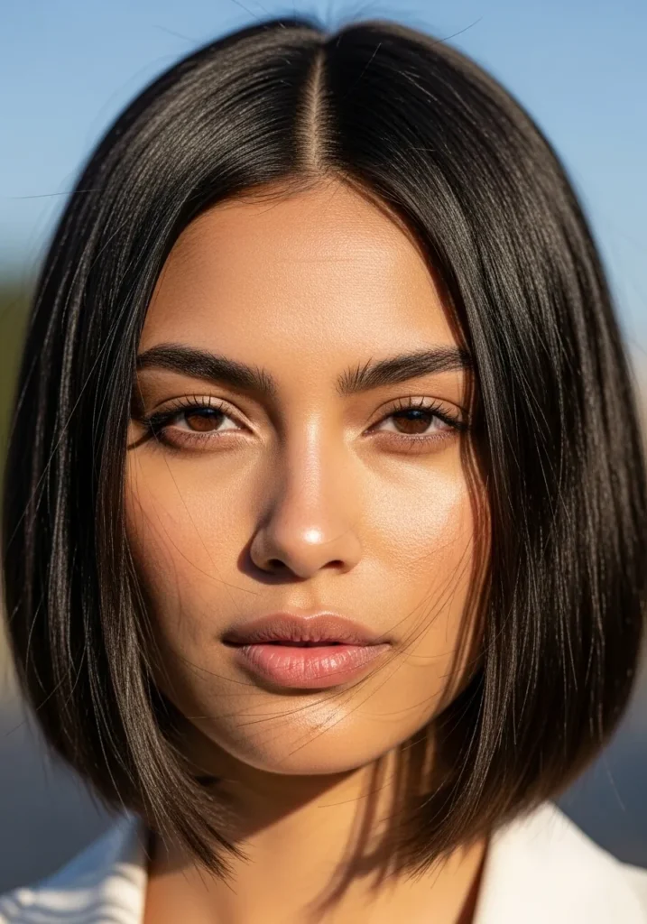 This look features a sleek, chin-length bob with a precise center part and polished, mirror-like shine. The ends are blunt and smooth, giving it that ultra-modern, put-together appearance.
