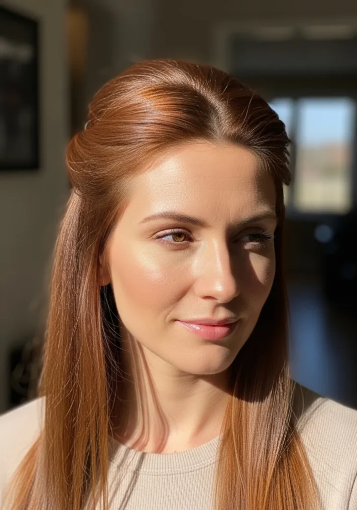 This hairstyle combines the smoothness of straight hair with a touch of height at the crown. The top section is gently teased and pinned back, while the rest falls sleek and shiny. The soft copper tone catches light beautifully.