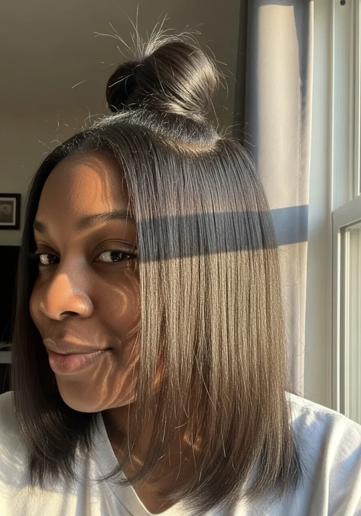 This style mixes polish with a little fun. The straight shoulder-length hair is parted down the middle and pulled into a small bun at the crown. The strands are sleek and shiny, creating a contrast between the structured bun and the smooth texture below.