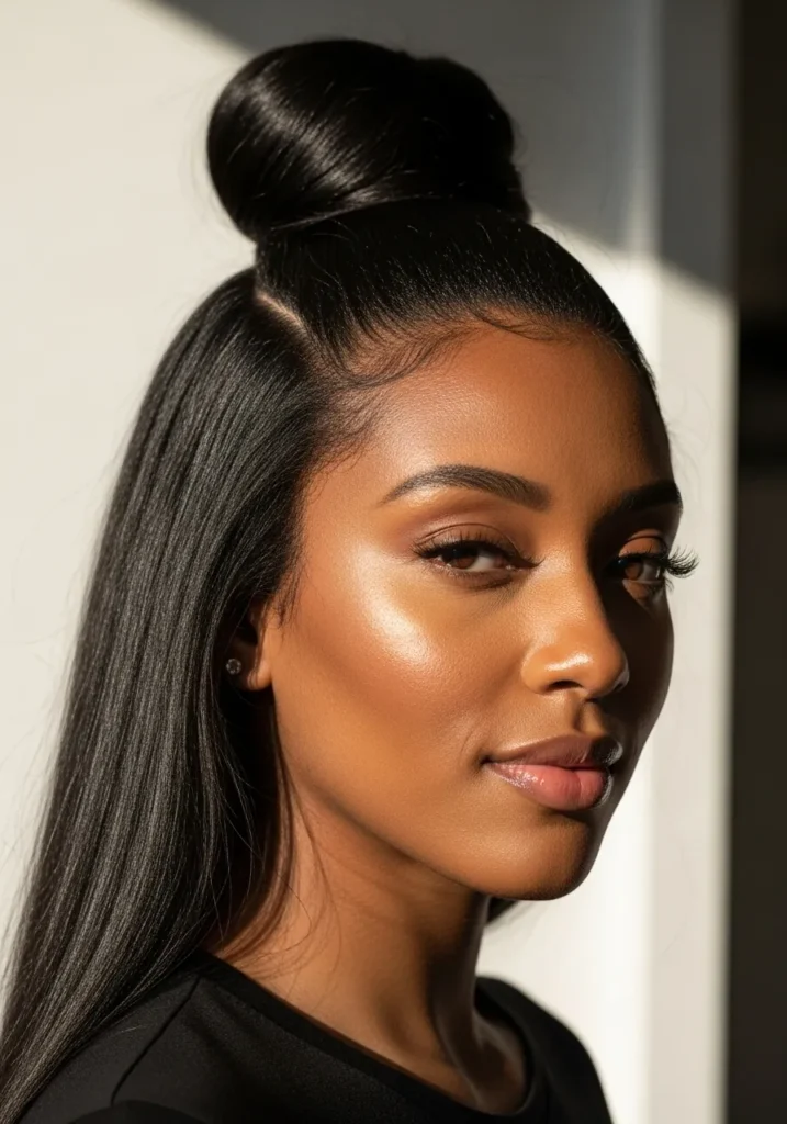 This style combines the best of both worlds—a sleek high top knot and long, straight hair cascading down. The glossy black strands catch the light beautifully, and the pulled-back top section adds height and structure.