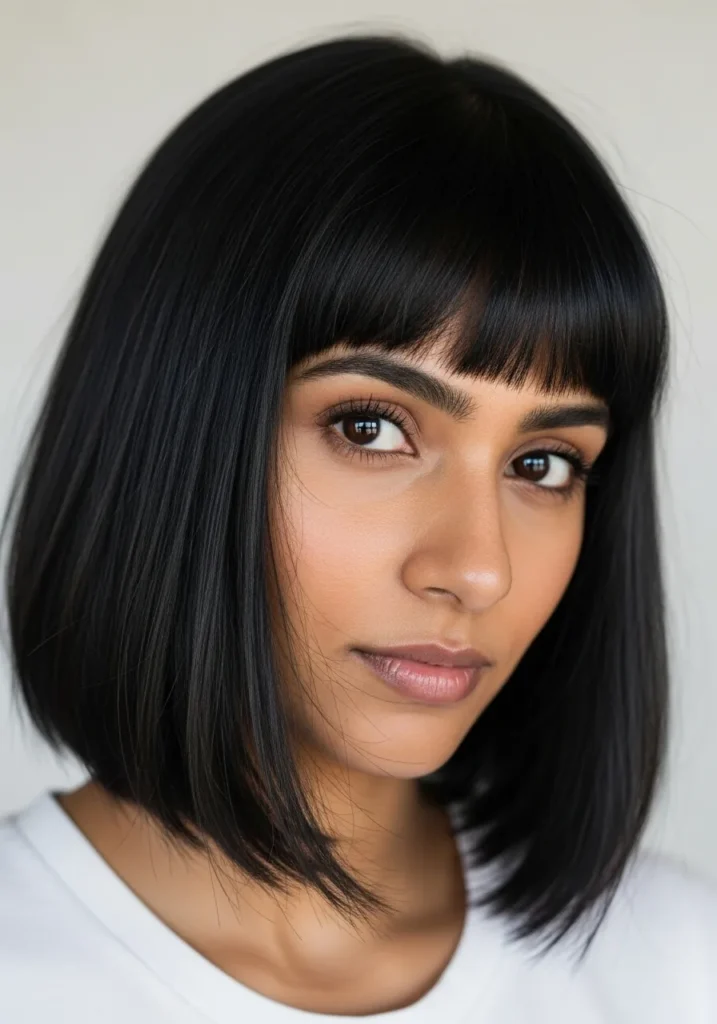 This sleek bob features perfectly straight strands cut just below the jawline with sharp, blunt ends. The bangs are short and softly feathered, giving the style a slightly edgy but polished look. The jet-black color adds depth and definition.