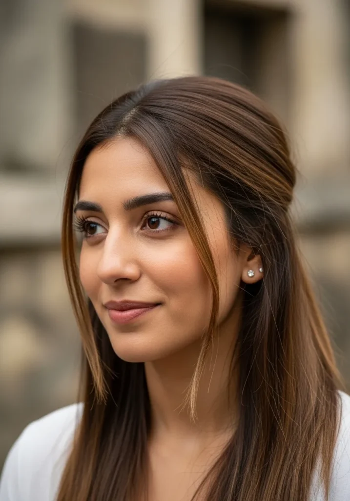 This hairstyle blends simple and elegant effortlessly. The long, smooth strands are half pulled back with two pieces left loose in front for a soft face-framing effect. The warm brown color adds a touch of natural glow.