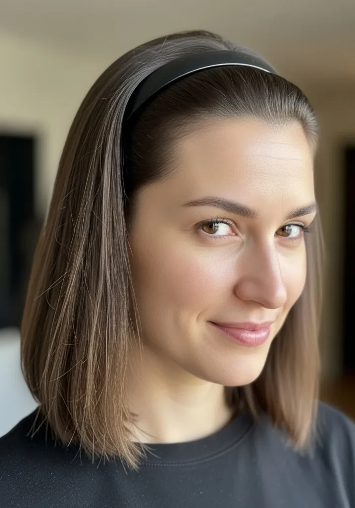 This hairstyle is the definition of chic simplicity. Straight medium-length hair is tucked behind a glossy black headband, giving it that clean and modern edge. The texture is smooth and shiny, showing off the cut perfectly.